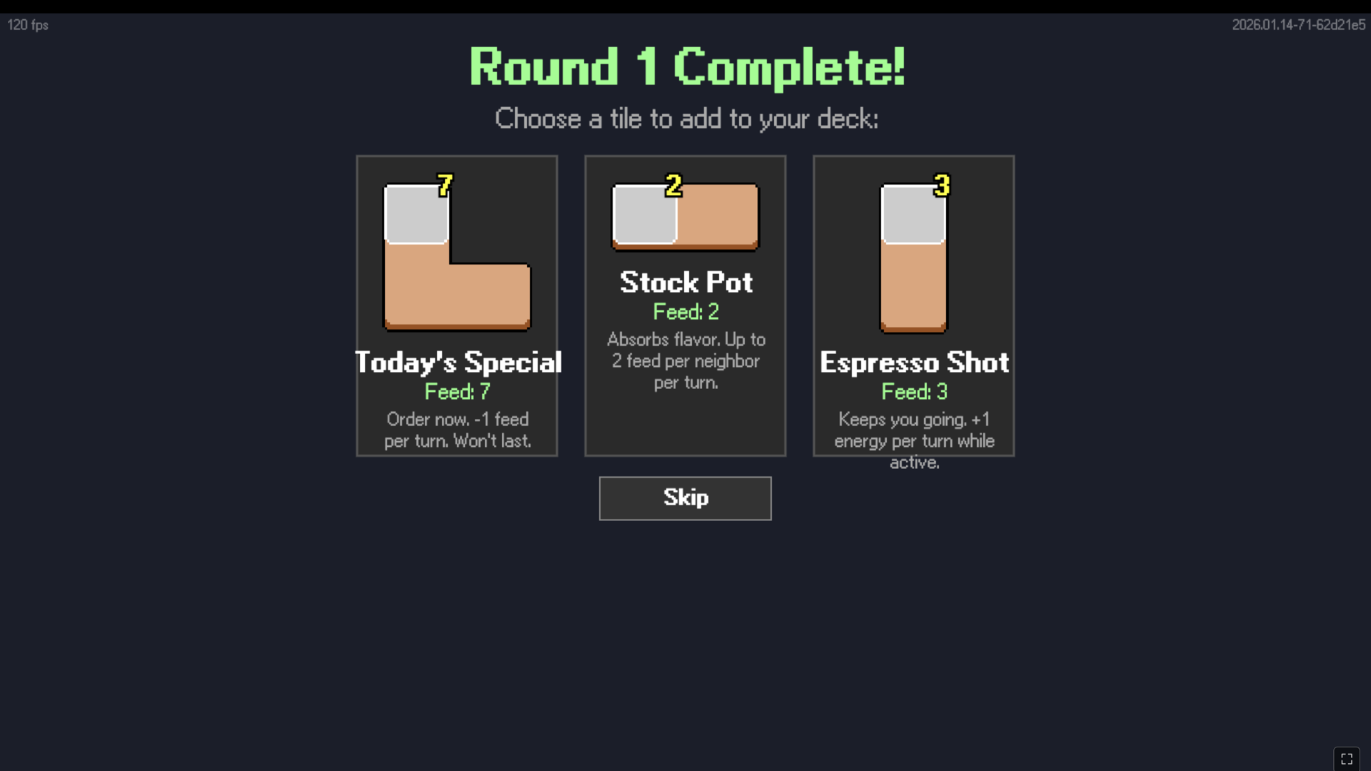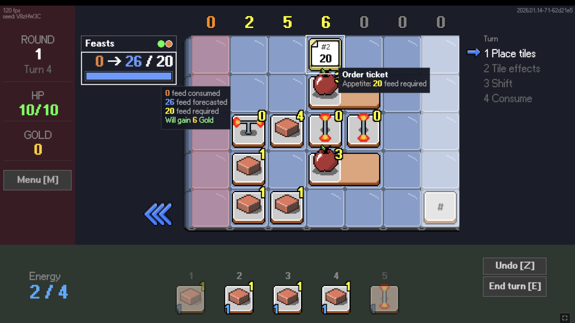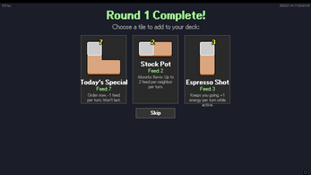 This is an early build: the core loop is working and playable. Placement, shifting, feasting, deck building, shop, multiple customer schedules and scoring rules, 15+ tile types with active/consumed/placement effects.